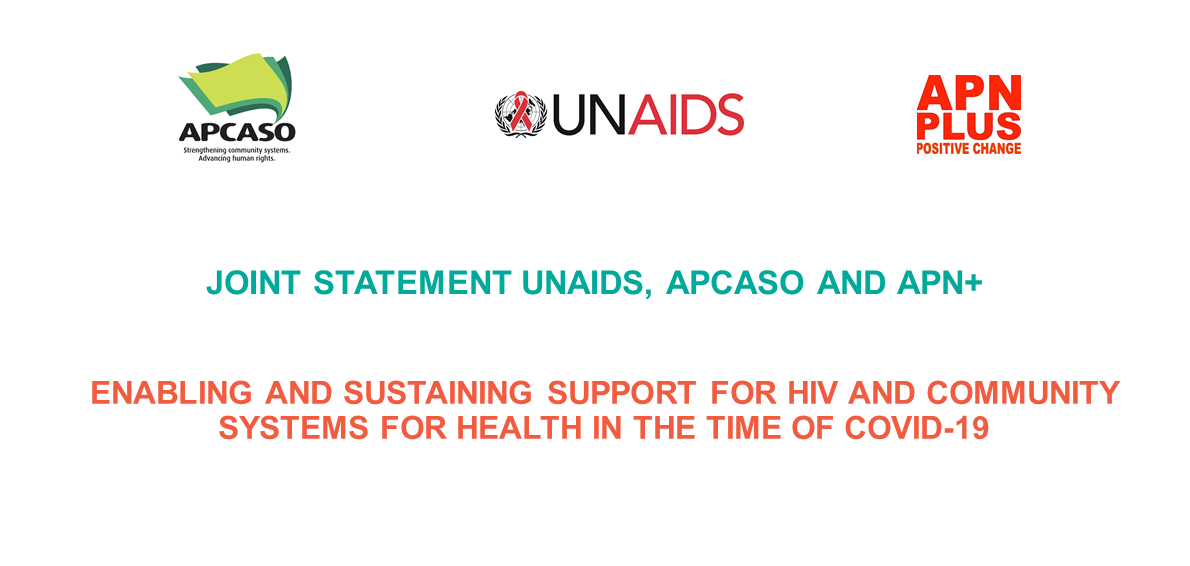 As we move from the acute response phase to a longer-term sustainable approach, UNAIDS, APN+ and APCASO emphasize that it is critical to proactively acknowledge the strong community systems for health that have been built over the years of the HIV response, and to protect, use and expand those systems to deliver services for health for people affected by HIV, COVID-19, tuberculosis and other diseases.