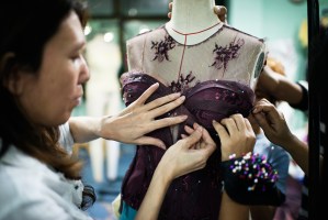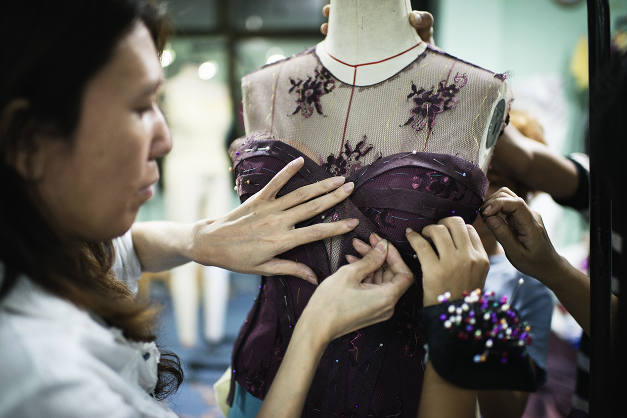 ← Pauk Pauk working in her atelier in Yangon.