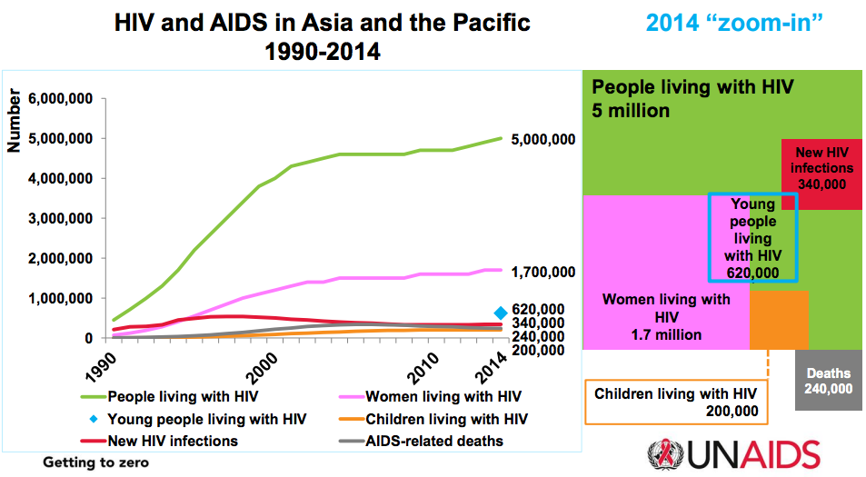 Asia and the Pacific countries have made impressive progress in halting and reversing the AIDS epidemic in the last 15 years. New HIV infections have declined 31% between 2000 and 2014. There has been a rapid scale up of antiretroviral treatment, with 1.8 people living with HIV accessing treatment in 2014. This is about a third of everyone living with HIV. There were also 30% fewer AIDS-related deaths in 2014 than in 2005.